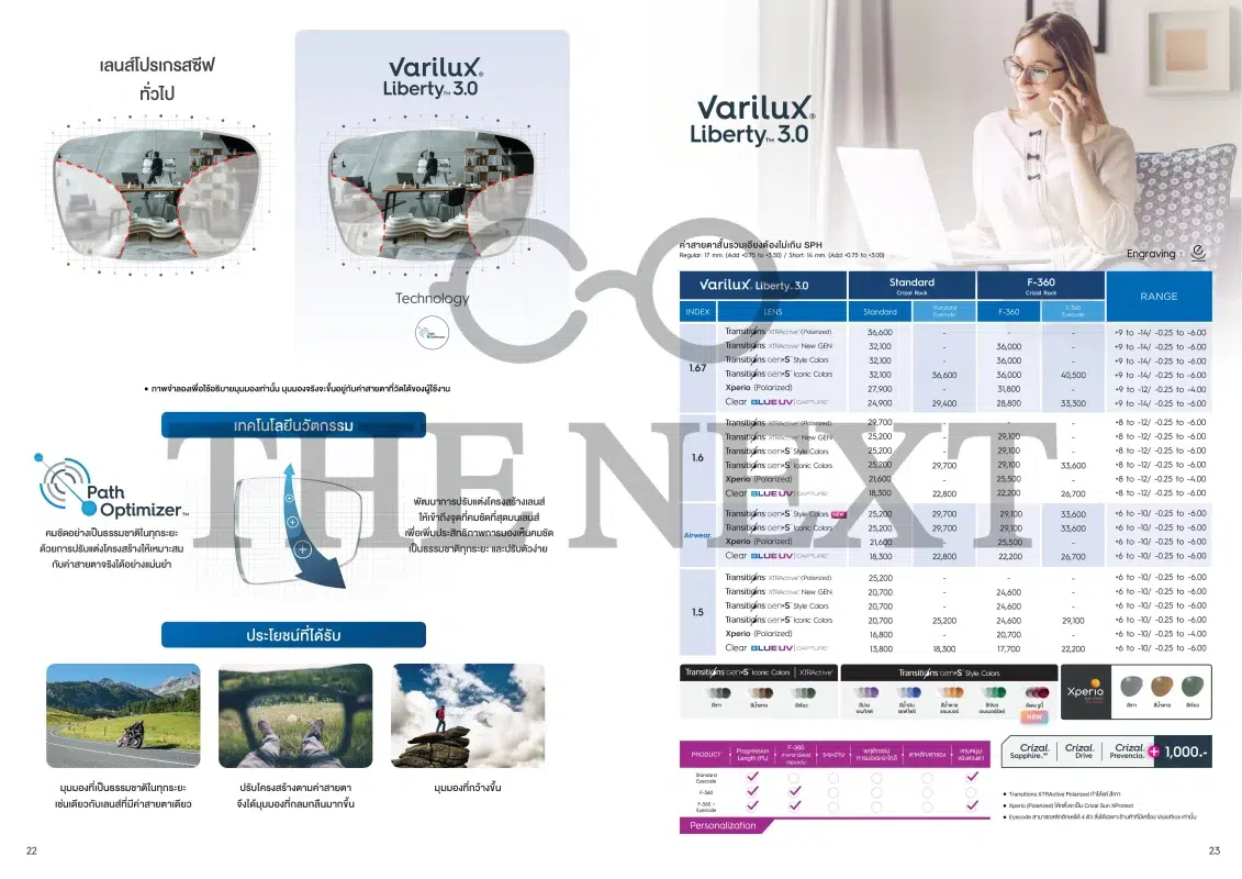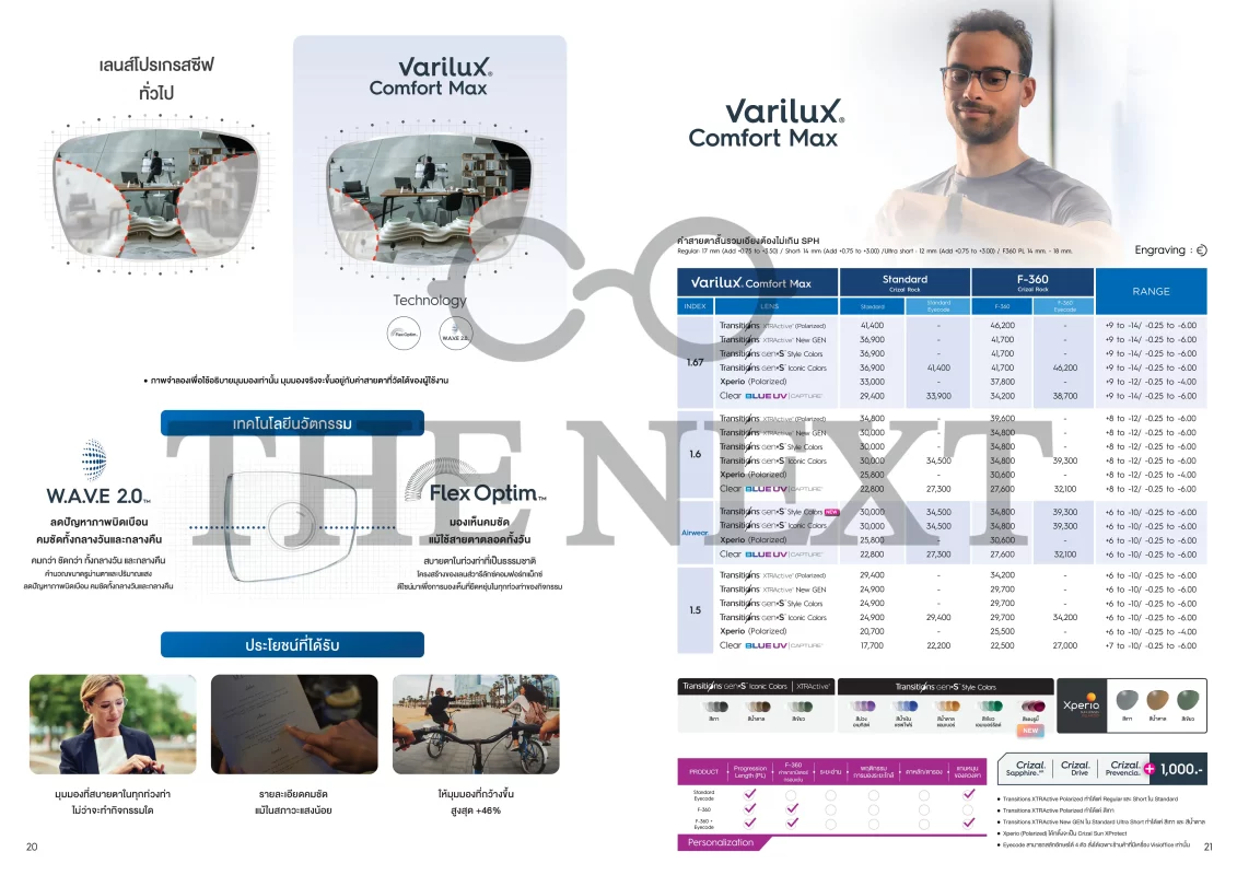 - จุดเด่น: เป็นเลนส์โปรเกรสซีฟอันดับ 1 ของโลก ที่ให้การมองเห็นคมชัดทุกระยะ (ไกล-กลาง-ใกล้) อย่างนุ่มนวลและเป็นธรรมชาติ ลดภาพบิดเบือนด้านข้าง ทำให้ปรับตัวง่าย