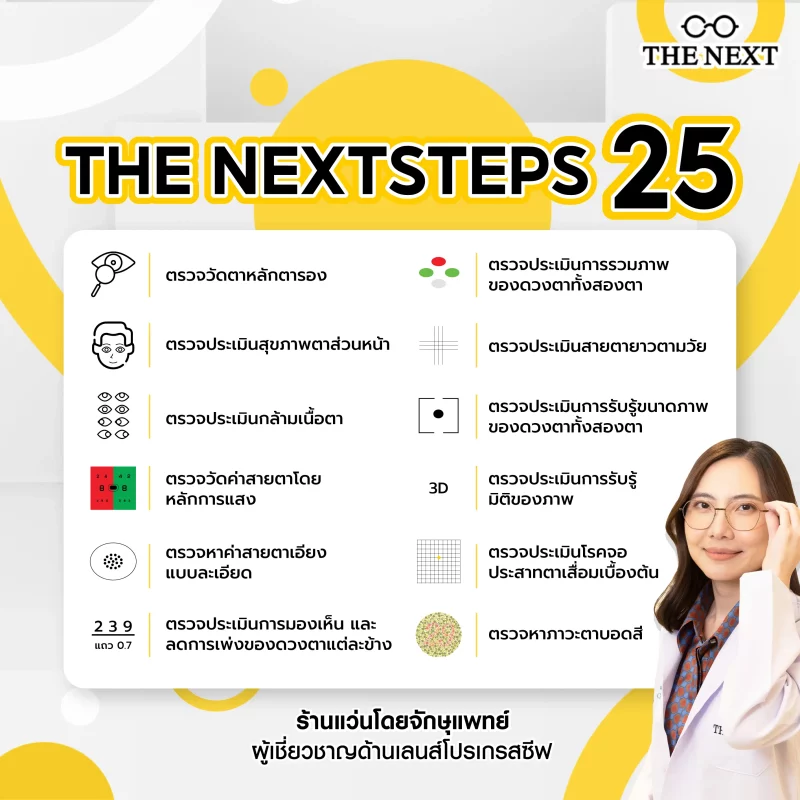 เพราะเรามีประสบการณ์จากรุ่นสู่รุ่นกว่า 65 ปี ให้บริการตรวจวัดสายตาโดยจักษุแพทย์ นักทัศนมาตรผู้เชี่ยวชาญ และยังมีเครื่องมือที่ทันสมัยโดยได้นำเข้าเครื่องวัดสายตา WAM-700 ที่แรกในเอเชีย ที่สามารถวัดค่าสายตาได้ละเอียดถึง 0.01 D นอกจากนี้ยังสามารถตรวจโรคตาก่อนโรคลุกลามได้ โดยเรามีการตรวจสายตาแบบครบวงจร THE NEXT Steps 25 ขั้นตอน หากคุณสนใจสามารถนัดหมายล่วงหน้าได้ที่ FACEBOOK หรือ Line@Thenextoptical