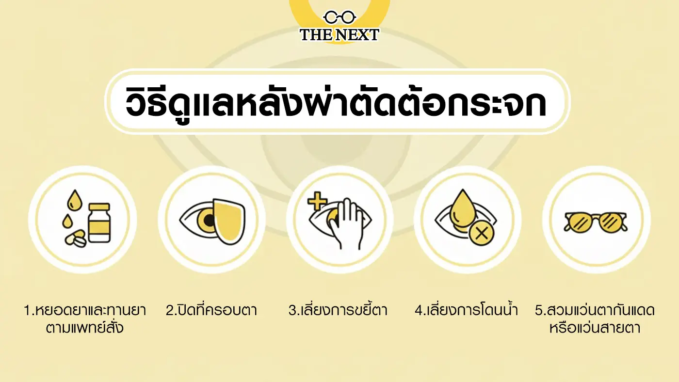 สิ่งสำคัญที่ควรทำหลังการผ่าตัดต้อกระจกคือ ทำตามคำสั่งแพทย์อย่างเคร่งครัดและไปตรวจตามนัดอย่างสม่ำเสมอ ส่วนวิธีดูแลตัวเองที่ควรเน้น คือ