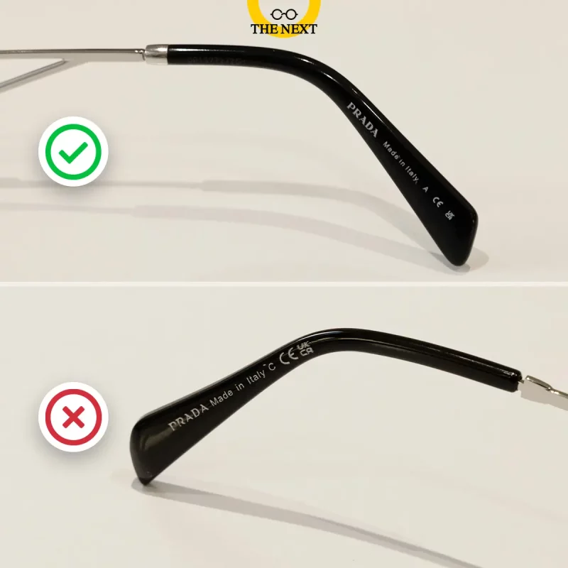 ให้สังเกตตัวอักษร R ใน โลโก้ Pradaต้องมีรอยบากเล็กๆ ที่มุมขวาล่าง ไม่ใช่ตัว R ตรงๆตัวอักษรต้องสลักด้วยเลเซอร์คมชัด สม่ำเสมอ ฟอนต์ไม่หนา–บางผิดปกติ ระยะห่างของตัวอักษรเท่ากัน ขาแว่นเรียบ ไม่มีรอยบิ่นหรือรอยโค้งผิดรูป