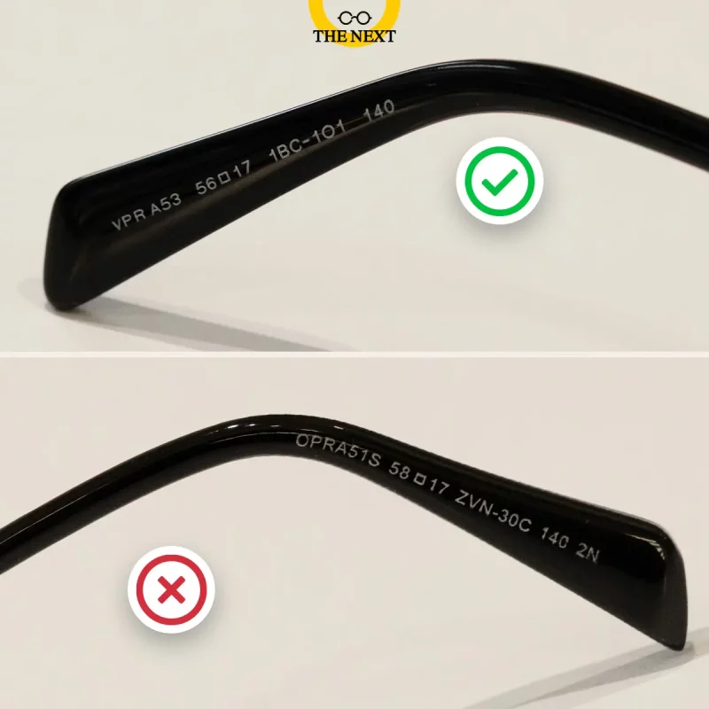 ด้านในขาแว่นทุกอันจะมีรหัสประจำรุ่น เช่น SPRxxxxพร้อมบอกขนาด รหัสสีเลนส์ตรงกับที่ Prada ระบุไว้ เช่น 54-18-145 ซึ่งต้องตรงกับฐานข้อมูลที่เว็บไซต์ PRADA และ Luxottica ใช้จริง ถ้าเลขรุ่นผิด บอกได้เลยว่าเสี่ยงเป็นของปลอมสูง