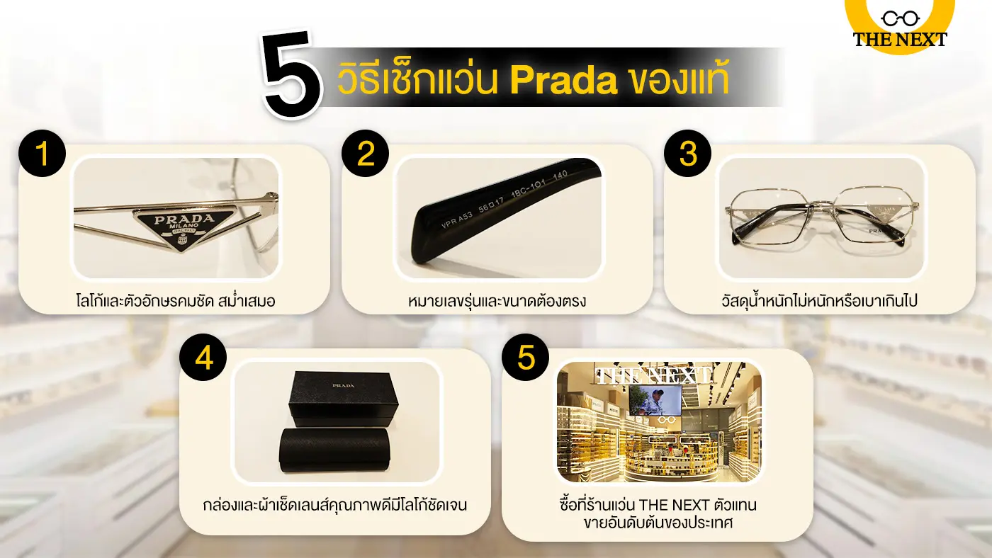 แว่น Prada เป็นแบรนด์ที่ได้รับความนิยมอันดับต้นๆในปี 2025 ทำให้มีการก๊อปปี้ ผลิตของปลอมออกมามากมาย วิธีเช็คของแท้สามารถทำได้ง่ายๆด้วยตัวเองโดย โลโก้และตัวอักษรต้องคมชัด มีระยะห่างสม่ำเสมอ หมายเลขรุ่นและขนาดต้องตรงกับฐานข้อมูลที่เว็บไซต์ วัสดุต้องมีน้ำหนักบาลานซ์ไม่เบาไปหรือหนักไป อุปกรณ์เสริม เช่น กล่องและผ้าเช็ดเลนส์ต้องมีคุณภาพดี ปั๊มโลโก้ Prada ชัดเจน วิธีที่ดีที่สุดที่คุณจะมั่นใจว่าได้ซื้อแว่น Prada ของแท้ ให้มาที่ร้านแว่น THE NEXT ทุกสาขาเพราะเราเป็นตัวแทนขายอันดับต้นของประเทศ มีคอลเลคชั่นให้เลือกเยอะที่สุด