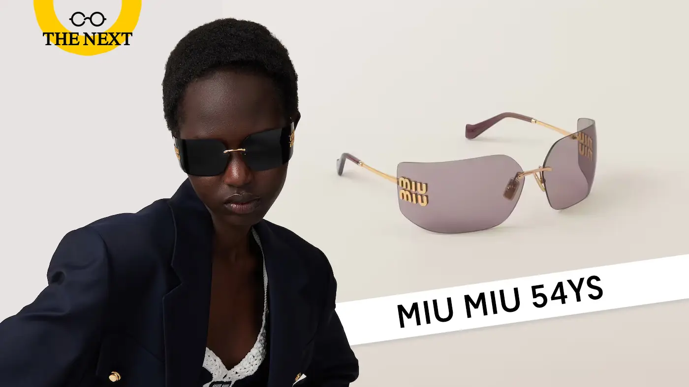 - Miu Miu 54YS แว่นดีไซน์เลนส์โค้งไร้กรอบ เพิ่มลูกเล่นความหรูหราด้วยโลโก้ Miu Miu แนวตั้ง ขนาดใหญ่บริเวณโค้งของเลนส์ ทำให้ผู้ส่วมใส่ดูเป็นผู้นำแฟชั่น