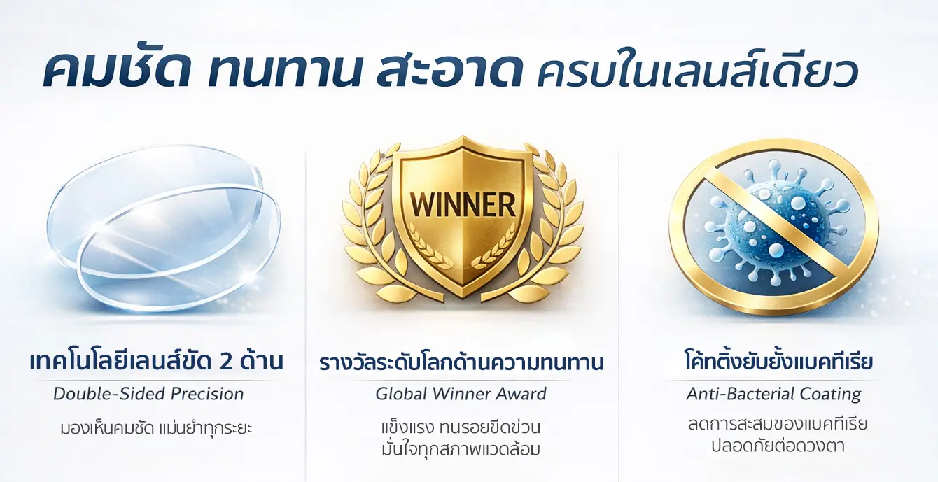 - เทคโนโลยีขัดเลนส์ 2 ด้าน เพื่อการมองเห็นที่แม่นยำ