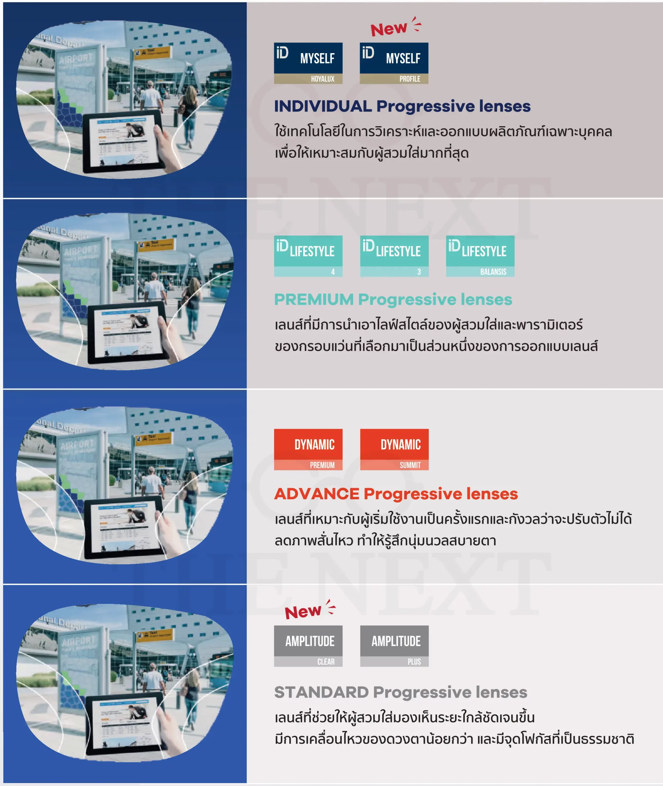 Hoya เป็นแบรนด์เลนส์โปรเกรสซีฟจากญี่ปุ่นที่มีประสบการณ์กว่า 80 ปี โดดเด่นด้วยเทคโนโลยีขัดเลนส์ 2 ด้าน (Double Surface Freeform Technology) ที่เป็นแบรนด์แรกของโลก และโค้ทติ้งที่ทนทานจนคว้ารางวัล Winner Award ระดับโลก ปัจจุบันมีเลนส์โปรเกรสซีฟให้เลือก 4 รุ่น ได้แก่ Amplitude, Dynamic, Lifestyle และ iD Myself ราคาตั้งแต่ 6,000 – 58,500 บาท แต่ละรุ่นมีเทคโนโลยีที่แตกต่างกันเพื่อตอบโจทย์ไลฟ์สไตล์ของผู้ใช้ และหากต้องการเลนส์ Hoya ของแท้ควรเลือกซื้อกับผู้เชี่ยวชาญที่ร้าน THE NEXT กว่า 30 สาขา