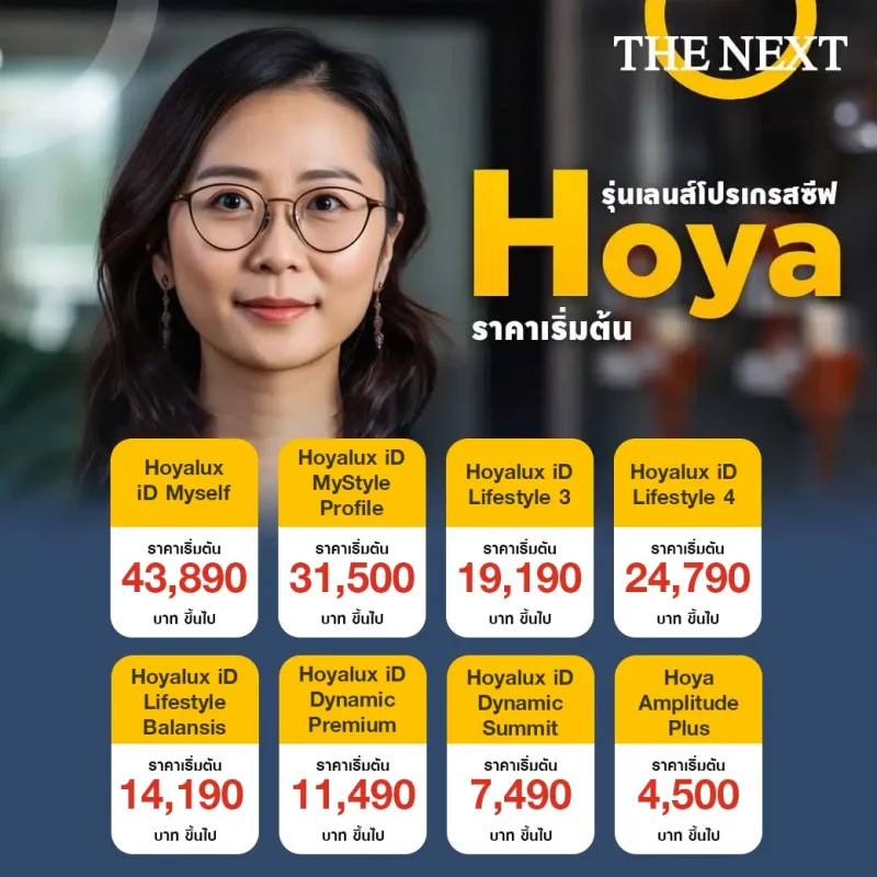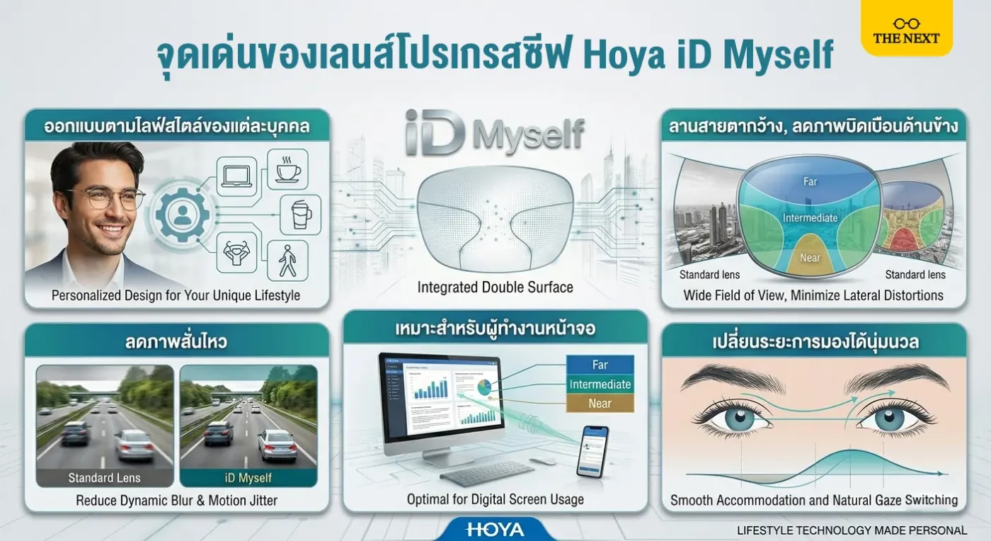 Hoya iD Myself คือเลนส์โปรเกรสซีฟระดับพรีเมียมที่ออกแบบเฉพาะบุคคล 100% ด้วยเทคโนโลยีขั้นสูงจาก Hoya ประเทศญี่ปุ่น มอบการมองเห็นคมชัดทุกระยะ ลดภาพบิดเบือนและสั่นไหว เหมาะกับไลฟ์สไตล์ยุคดิจิทัล ราคาเริ่มต้นที่ 58,500 บาท พร้อมบริการตรวจวัดสายตาและทดลองเลนส์ฟรีที่ THE NEXT