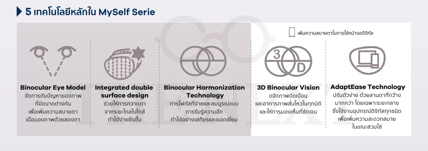 เลนส์ Hoya iD Myself ใช้เทคโนโลยีเฉพาะ เช่น Binocular Harmonization และ AdaptEase ที่ช่วยลดภาพบิดเบือนและเพิ่มความคมชัดทุกระยะเมื่อเทียบกับเลนส์โปรเกรสซีฟมาตรฐาน