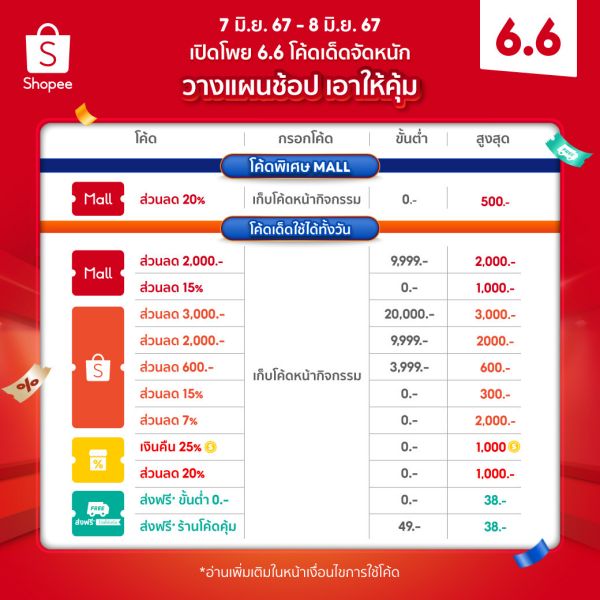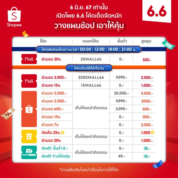 ห้ามพลาด วันที่ 6 มิถุนายน 2567 เก็บโค้ดส่วนลดพิเศษตามเวลา 00.00 / 12.00 / 18.00 / 21.00 น. Shopee Mall โค้ดส่วนลด 20% กรอกโค้ด 20MALLL66 ลดสูงสุด 500 บาท ช้อปขั้นต่ำ 0 บาท พร้อมเก็บโค้ดใช้ได้ทั้งวัน ดังนี้