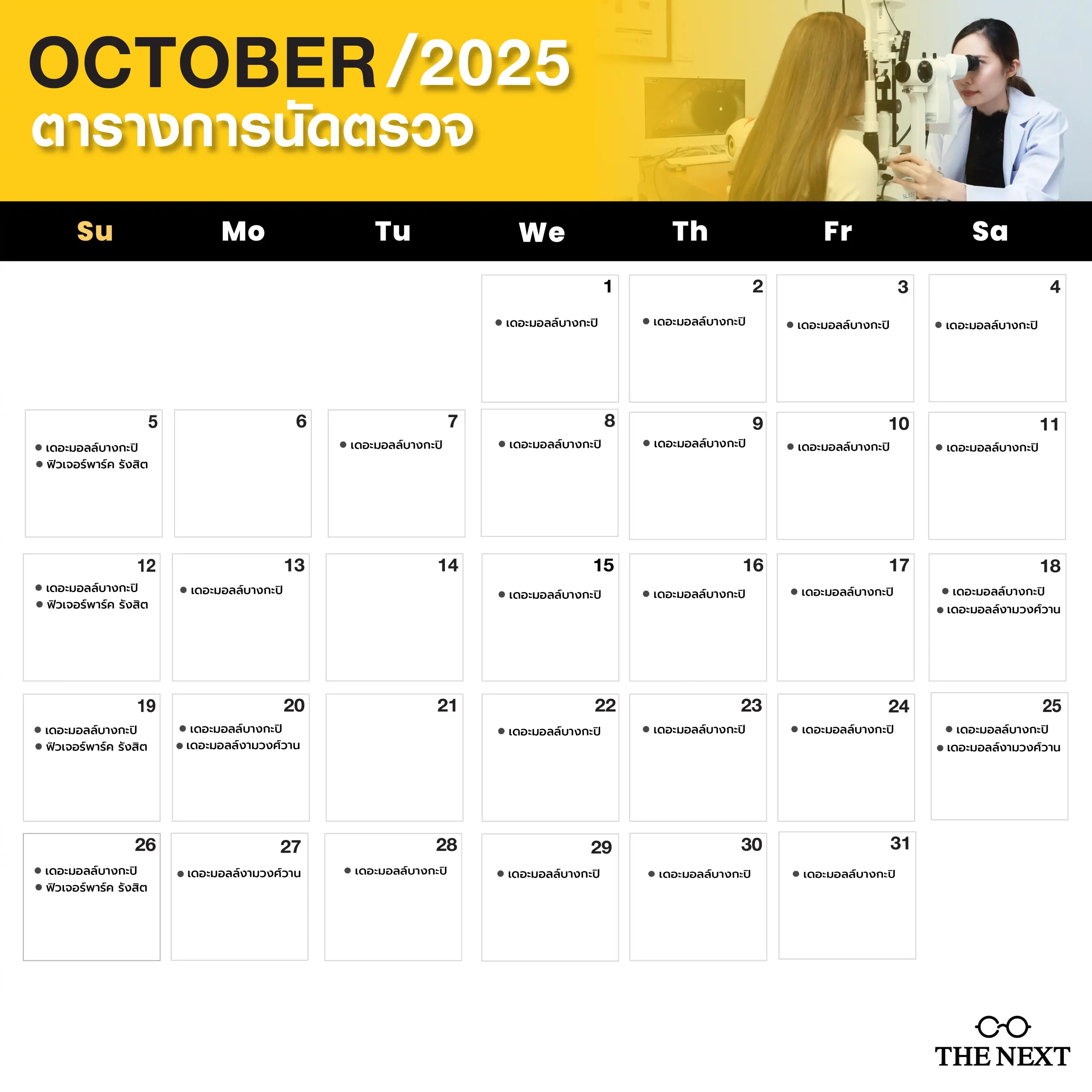 สำหรับตารางนัดหมอตาเฉพาะทางที่ร้านแว่นตาที่มีจักษุแพทย์ THE NEXT สามารถเช็กที่นี่ได้เลย พร้อมให้บริการคำปรึกษาฟรี ไม่เสียค่าใช้จ่ายใด ๆ ทั้งสิ้นตลอดทั้งเดือนตุลาคม 2025